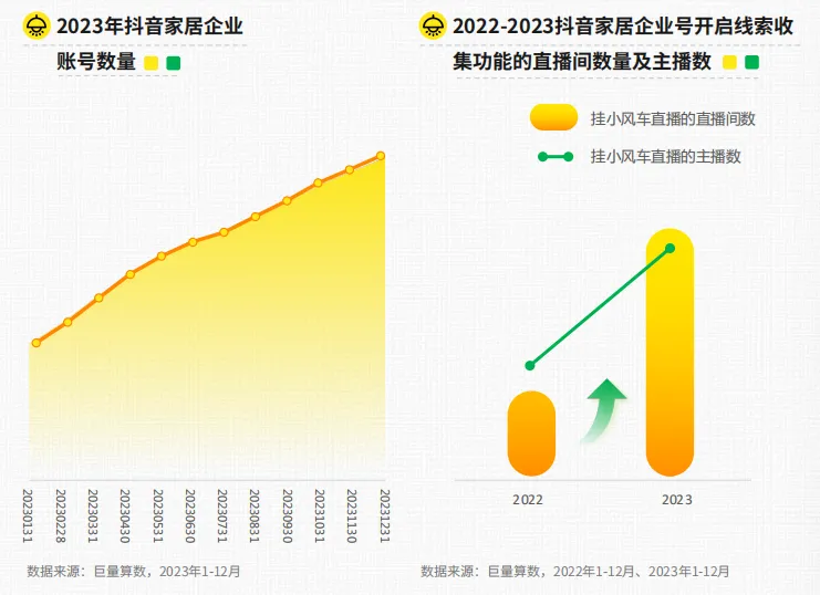巨量算数数据显示,2022-2023年家居企业开启线索收集功能的直播间数量及主播数呈双增趋势,其中线索收集功能开启率由3.8%快速增长至10.5%;家居企业通过直播间和短视频收集的线索量分别增长了697%和56%。