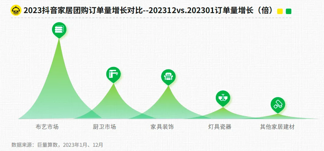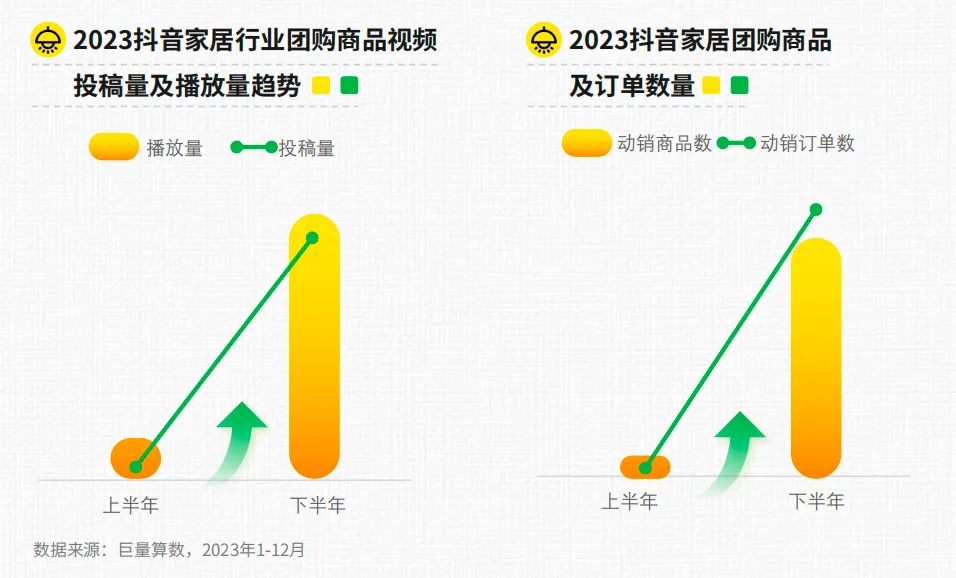 2023年下半年开始,抖音平台团购商品、视频投稿量、播放量、动销商品量、动销订单数均呈现爆发式增长,特别是厨卫市场、家具装饰、灯具瓷器类团购订单增长迅猛。