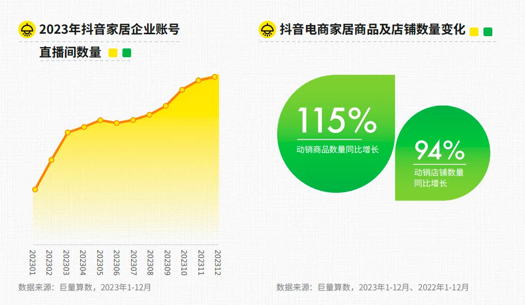 巨量算数调查显示,过去一年,全链路电商增速迅猛。2023年家居企业账号直播间数量增长超2倍,抖音电商动销商品数量增长115%,动销店铺数量增长94%,尤其是住宅家具、全屋定制与灯饰、大家电等细分品类商家增速更快,进一步强化了抖音作为大中小家居企业“营销必争之地”的地位。