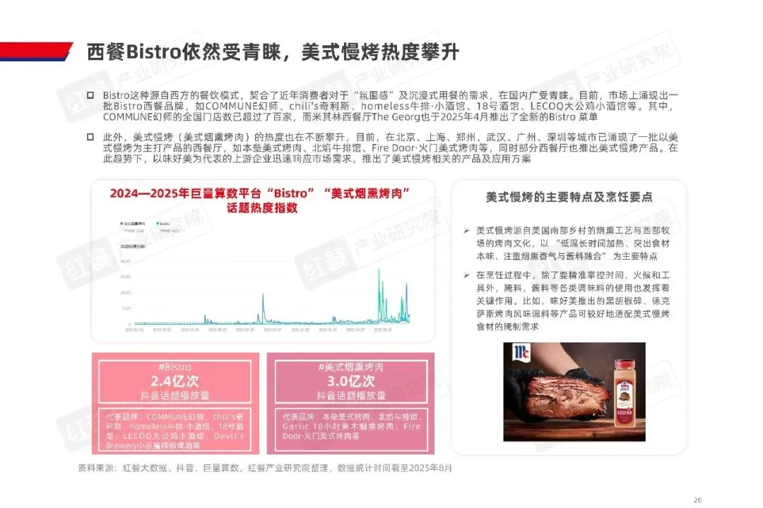 美式慢烤成为 2025 年西餐市场的热门品类,一些品牌凭借独特的烹饪方式和浓郁的风味,快速吸引消费者关注。这种单品聚焦的模式,能够降低运营成本、提升产品专业性,更容易形成口碑传播,成为中小品牌突围的重要路径。