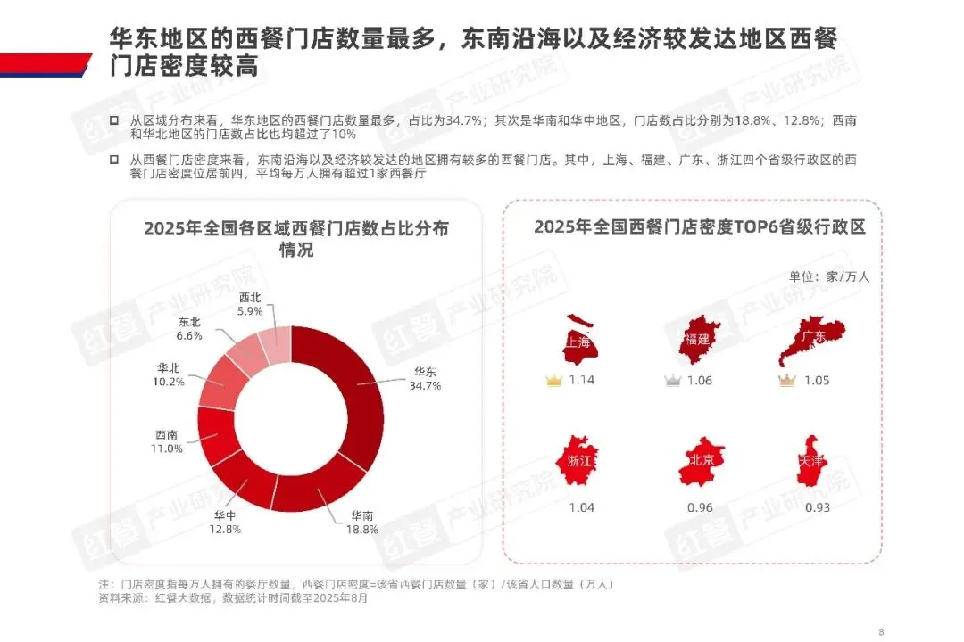 中国西餐市场的区域分布与经济发展水平、消费观念成熟度高度相关,呈现出 “东南密集、全国扩散” 的梯度格局。从区域分布来看,华东地区凭借经济优势和消费活力,成为西餐门店的核心聚集地,门店占比高达 34.7%,占据市场主导地位。
