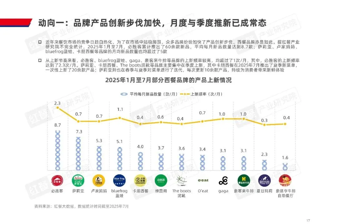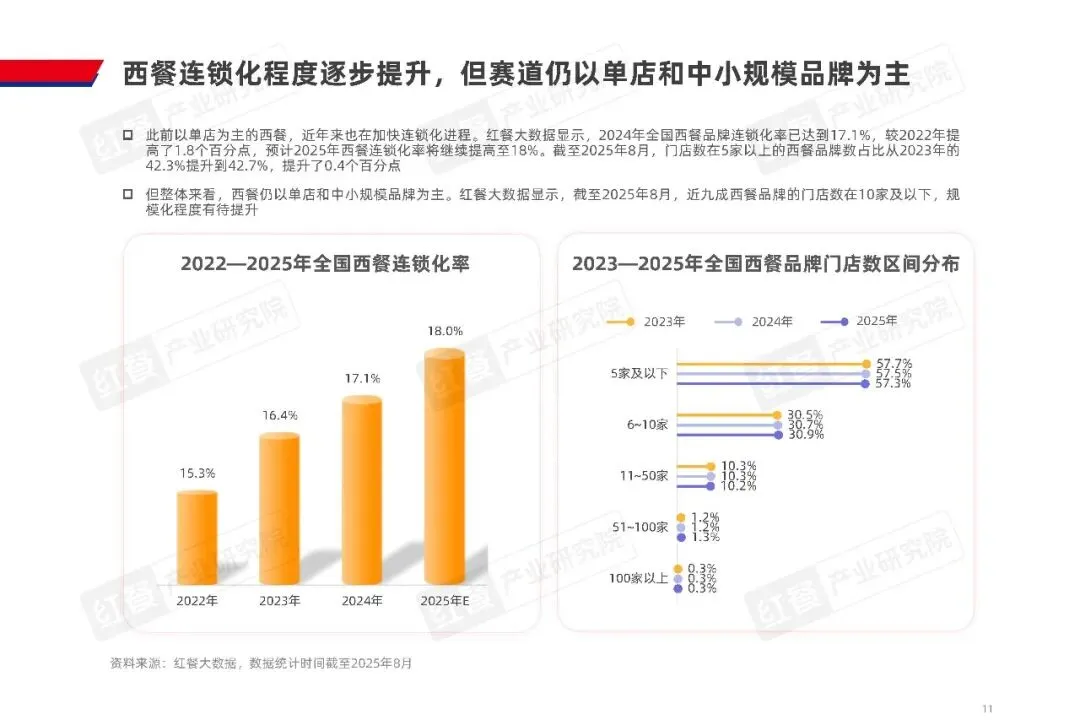 连锁品牌的扩张动力主要来自两个方面:一是标准化运营体系的成熟,让西餐的口味、品质和服务能够跨区域复制;二是消费市场对品牌信任度的提升,连锁品牌在食材安全、用餐环境等方面更具优势,更容易获得消费者喜爱。截至 2025 年 8 月,门店数在 5 家以上的西餐品牌数占比从 2023 年的 42.3% 提升到 42.7%,虽提升幅度不大,但反映出连锁品牌的市场占比正稳步扩大。