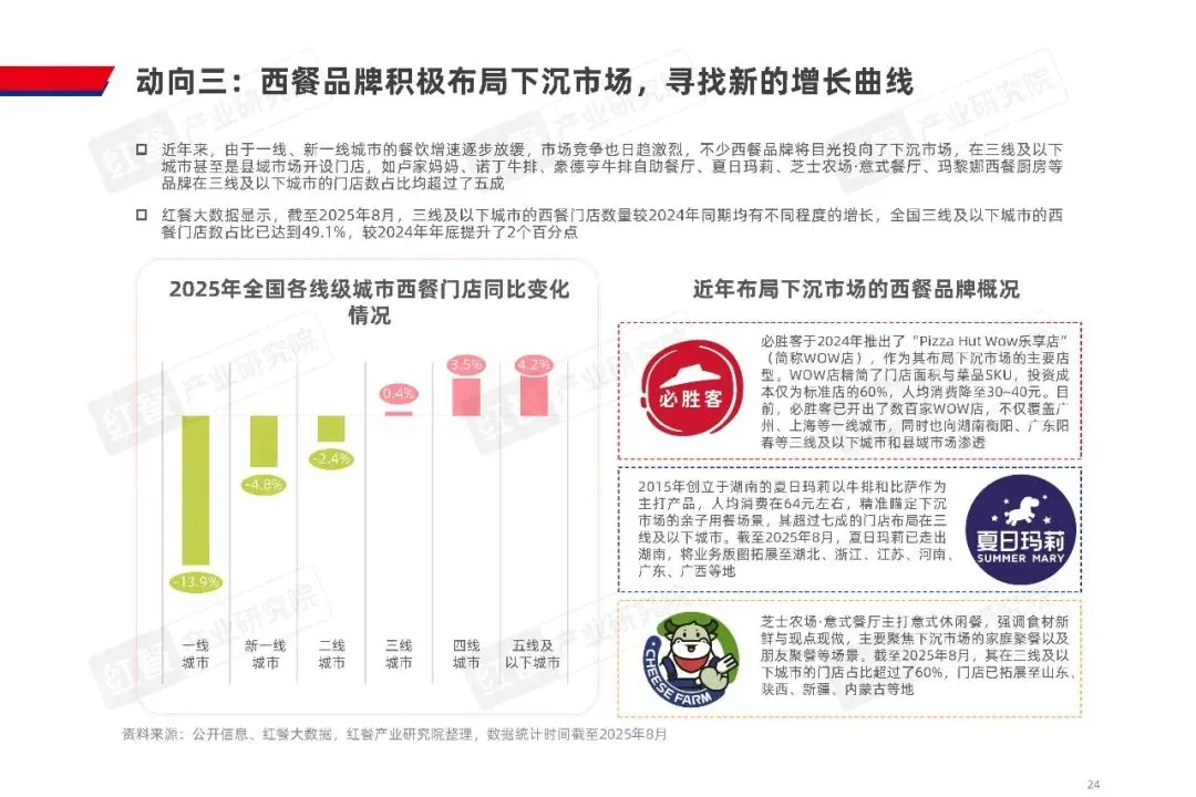 四线城市、五线及以下城市的西餐门店数占比均超过 10%,成为市场增长的新蓝海。县域市场消费能力的提升、年轻消费群体的回流,推动西餐门店向下沉市场加速渗透。这些区域的门店更注重性价比和本土化适配,以平价牛排、简式比萨等产品为主,快速抢占大众消费市场。