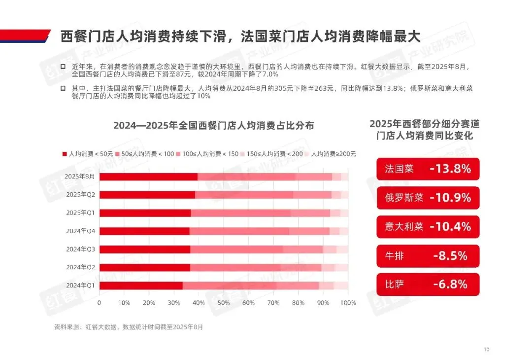 从消费价格来看,西餐人均消费呈现明显的下探趋势。2025 年西餐门店人均消费为 87 元,较 2024 年同期下降 7.0%,平价化消费成为市场主流。这一变化并非个例,而是全品类的普遍现象:曾经主打高端市场的法国菜餐厅,人均消费降至 263 元,同比下降 13.8%;俄罗斯菜、意大利菜餐厅的人均消费同比降幅也均超过 10%。价格回调让西餐摆脱了 “小众奢侈” 的标签,更广泛地触达大众消费群体,为市场规模的持续增长注入新动力。