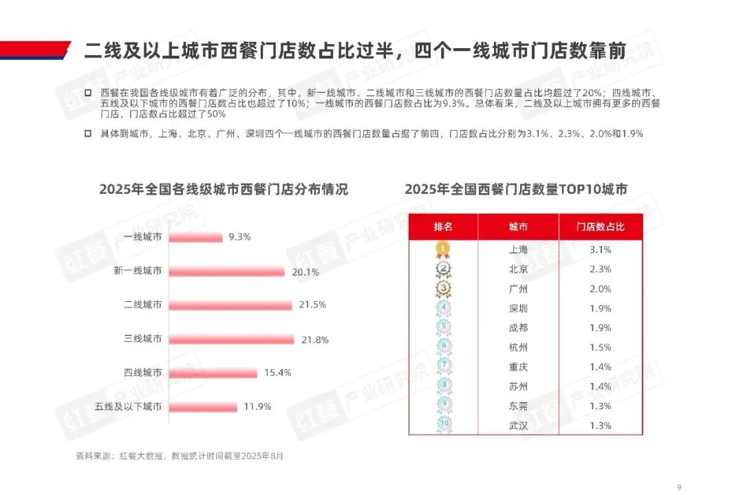 从线级城市分布来看,西餐市场呈现出 “中端发力、全域渗透” 的特征。新一线城市、二线城市和三线城市的西餐门店数量占比均超过 20%,二线及以上城市门店总数占比超过 50%,仍是市场的核心承载地。一线城市门店占比为 9.3%,虽占比不高,但单店营收和消费层次仍处于行业前列,是品牌形象展示和创新模式试点的重要阵地。
