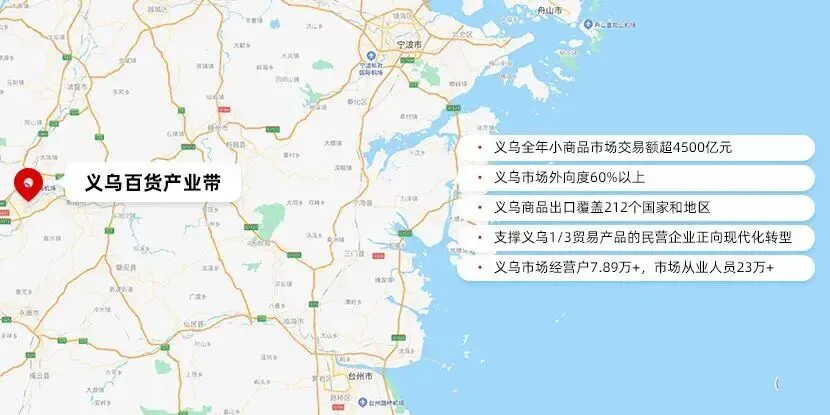 中国外贸跨境出海的核心产业带主要分布在沿海地区,比如广东、浙江、福建、江苏、山东四川等省市。义乌跨境出海产业发展更为突出,170多万种小商品汇聚于商贸城,出口到200多个国家和地区,跨境包裹量年超过1亿万件,义乌本地及周边县区拥有饰品、彩妆、光电、包装、卡片、针织、文具、五金、玩具、礼品、箱包、服装、工具、木雕、袜子、百货、医械、汽配、数码、家电、家具、鞋具、围巾、节庆、帽子、皮革等小商品生产基地和贸易专业街,未来将结合研发、设计、生产、贸易、物流、品牌一体化一条龙@铺货网“义乌样板”,从“鸡毛换糖”的走街串巷,到“世界超市”的数字链接,来世界义乌,做全球生意。