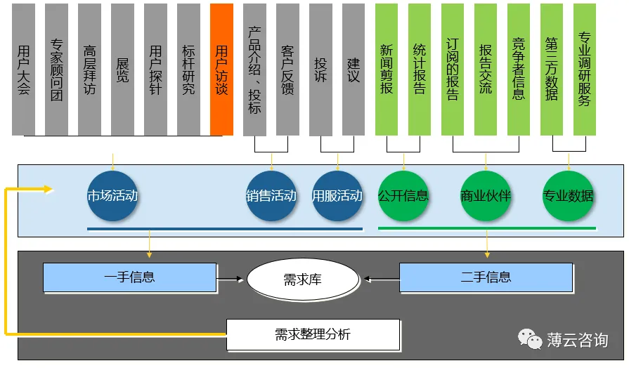 需求收集是生产高价值的客户需求和可能的产品包需求,为后续的分析、筛选和执行做准备。需求收集的方法多种多样,包括用户大会、用户访谈、新闻剪报、专业调研服务等十八种。