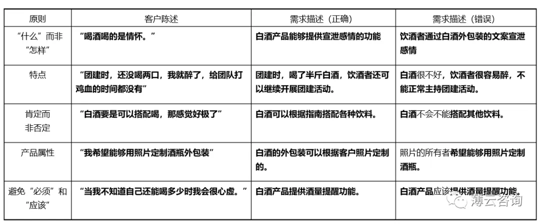确定客户的关键是分析清楚,谁是客户,谁是用户?掏钱买产品的用户称为客户,而真正使用产品的用户叫最终用户。客户与最终用户可能是同一个人也可能不是同一个人,因此要全盘考虑需求收集的对象。例如公司团建活动用酒,最终用户是参与团建活动的公司员工,而客户则是团建活动的组织者或领导,这些干系人都要充分考虑,才能令大家都满意。
