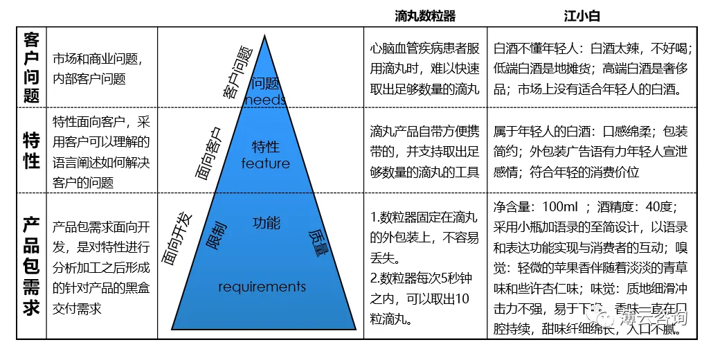 从这两个定义看,需求应该有三个层次:客户问题、产品特性、产品包需求。客户问题和产品特性相对好理解,但是产品包需求是什么呢?产品包是产品开发团队对客户或下游环节交付的统称,而产品包需求是对最终交付给客户(内客户、外部客户)的产品包的完整、准确的正式描述,是对产品包进行开发、验证、销售、交付的依据。下图为某快消品的需求分层架构示意图。