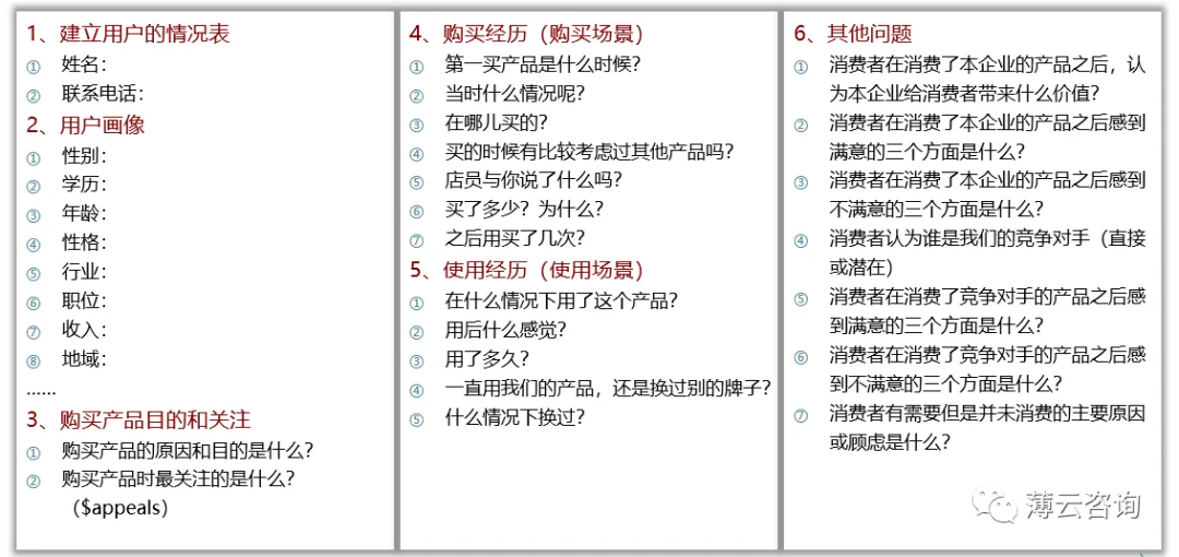 调查准备阶段的关键是目标、计划和调查问卷。调查问卷需要关注到客户的情况、购买产品的目的与关注、购买的经历、使用的经历、与其它厂家产品的一些对比等。具体如下图。