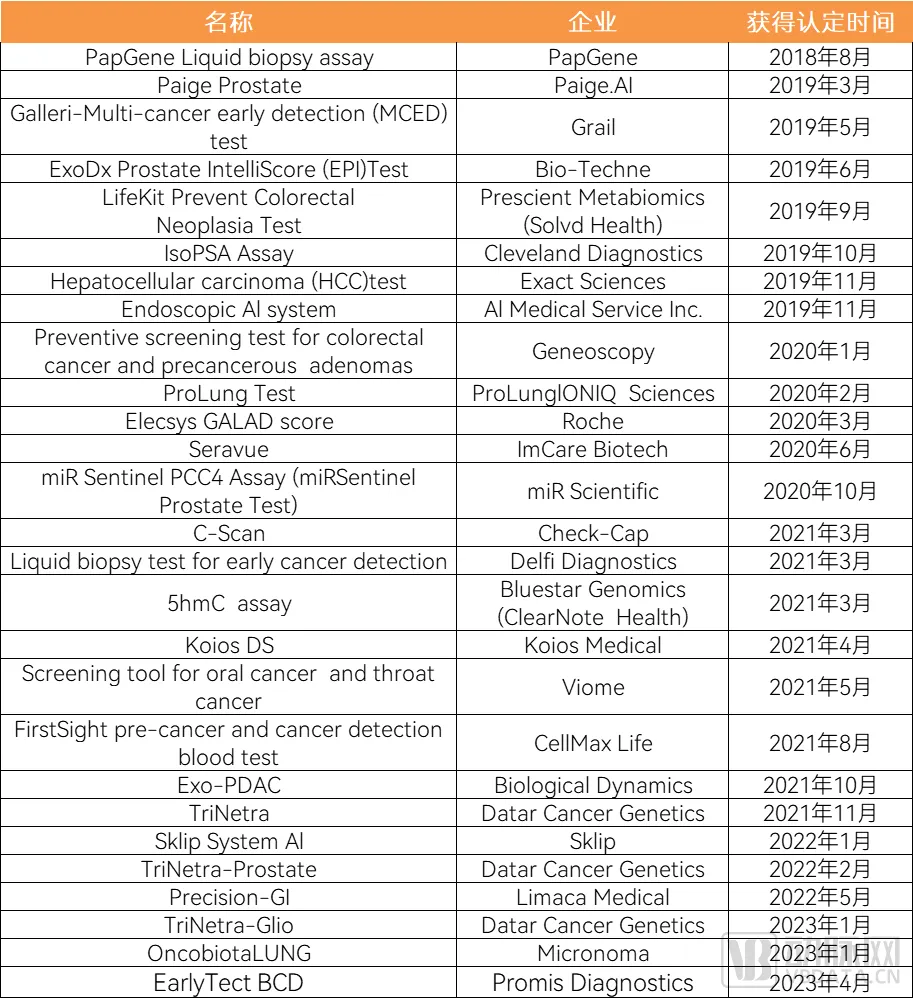 下表为国外企业在肿瘤筛查/诊断方面获批FDA突破性认定的相关盘点,从2018年开始共计获批27个,具体如下: