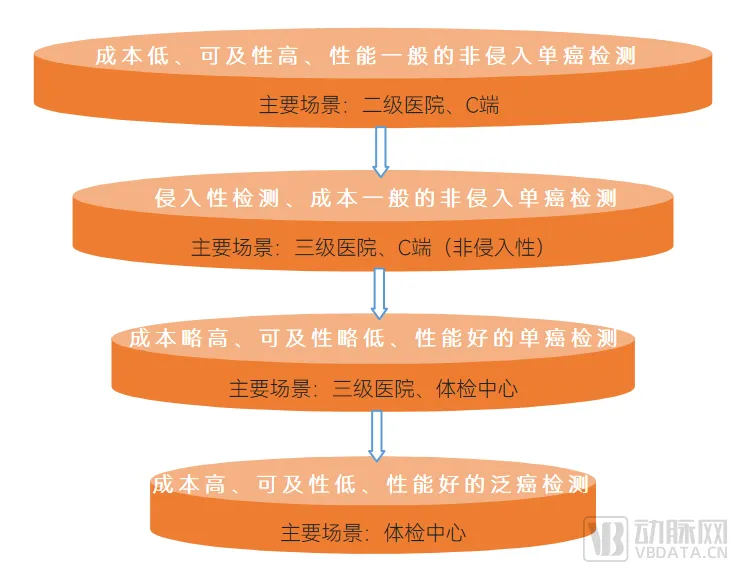 第二层是现状,即侵入性检测和成本一般的非侵入性检测,侵入性检测主要场景在三级医院,成本一般的非侵入性检测主要场景在三级医院和C端;第三层是成本略高、可及性略低、性能好的单癌检测产品,主要场景在三级医院和体检中心;第四层为成本高、可及性低、性能好的泛癌产品,主要场景在体检中心,具体如下: