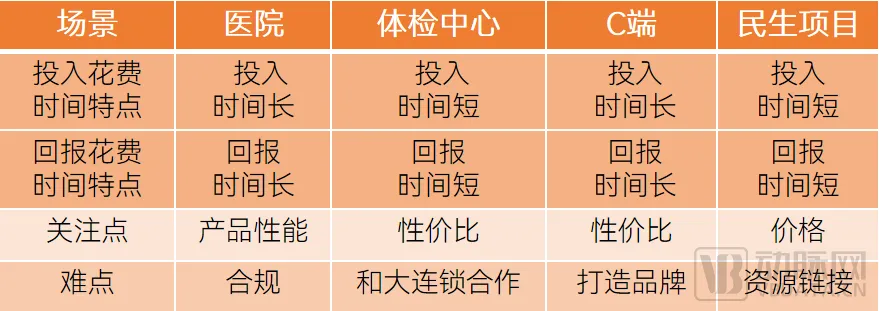 商业模式方面,目前主要是院端、体检端、民生项目及C端这四个方向。从实践上来看,院端和体检中心布局的企业最多,民生项目陆续有企业布局,C端布局较少。究其原因,每个场景的特点不一,投入回报和布局难度不同。具体如下: