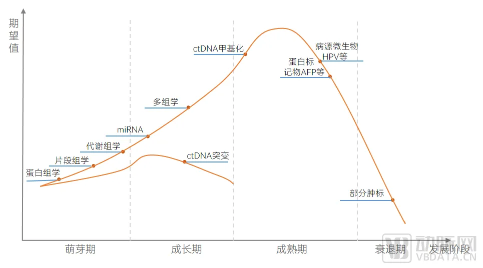 用于肿瘤早筛的各生物标志物产业化成熟度有差异。下图对用于肿瘤早筛的各生物标志物处于的发展阶段和期望值作了分析。其中,发展阶段包括萌芽期、成长期、成熟期和衰退期。如图,在成熟期期望值最高的是ctDNA甲基化,在成长期期望值最高的是多组学,具体如下: