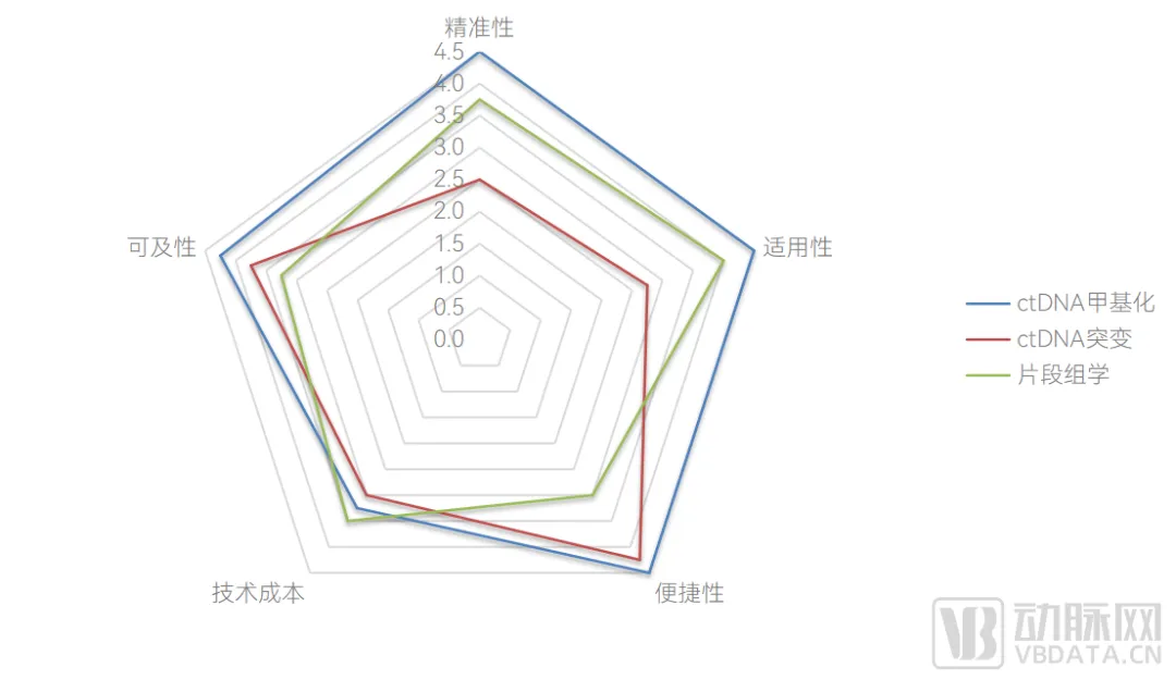 根据以上5个维度,我们对ctDNA甲基化、ctDNA突变、片段组学进行综合评价如下图,其中,ctDNA甲基化在五个维度上均占优势。