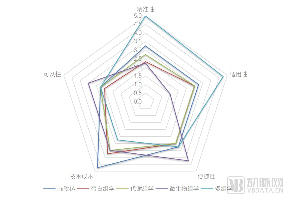 这里,我们同样对创新组学下的miRNA、蛋白组学、代谢组学、微生物组学和多组学进行“精准性、适用性、便捷性、技术成本和可及性”五个维度的评价。