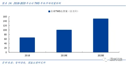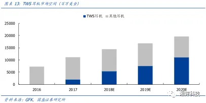 GFK预计2018年无线耳机出货量同比增加41%,市场规模将达54亿美金。到了2020年TWS无线耳机的市场规模将达到110亿美金。