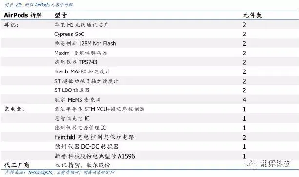 Airpods 1.5代发布,相关第三方机构第一时间进行细致拆解,我们认为从中能够石锤TWS耳机对高阶128M NOR flash的需求拉动,同时除苹果外基于联发科及高通CSR平台的产品亦采用了类似方案,我们继续强调,TWS耳机将成为消费电子2019-2020年的一抹亮色、同时亦将成为高阶NOR的X因素。
