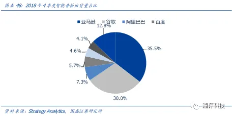 伴随着人工智能技术落地,谷歌、亚马逊、京东及百度等互联网巨头都争先在消费lOT进行布局,相继推出智能音箱。根据Strategy Analysis统计,2018年四季度全球智能音箱分布格局中,出货量排在前三位的分别问为亚马逊、谷歌与阿里巴巴,共占73%市场份额。