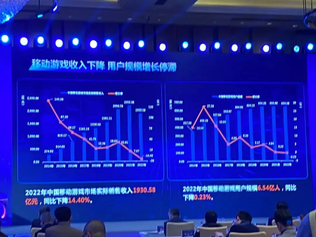 2022年中国移动游戏市场实际销售收入1930.58亿元,同比下降14.40%移动游戏用户规模6.54亿,同比下降0.23%,用户增长已趋向停滞。