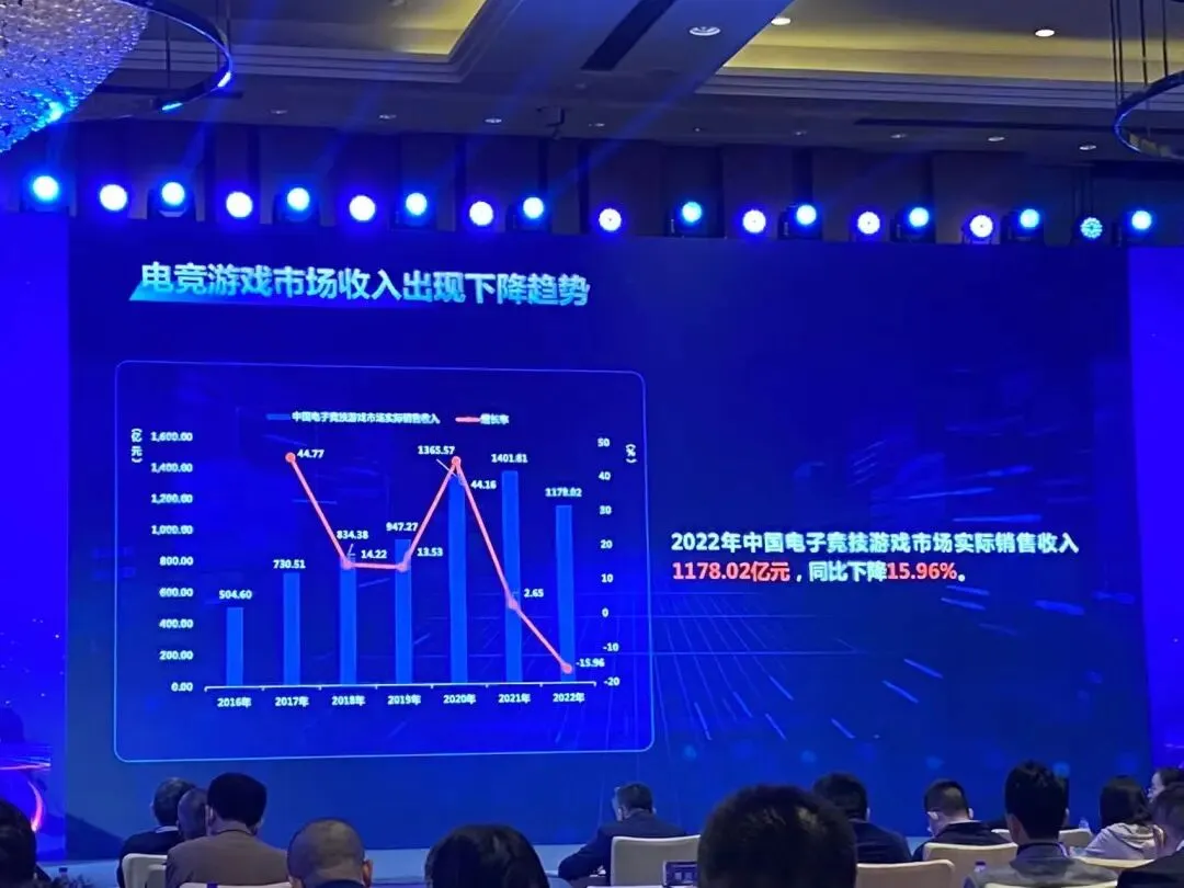 2022年中国电子竞技游戏市场实际销售收入1178.02亿元,同比下降15.96%。疫情造成整体市场低迷,电子竞技由于缺少爆款新品,市场收入下滑在所难免。