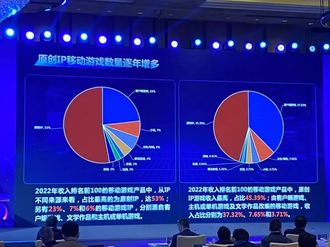 2022年收入排名前100的移动游戏产品中,从IP不同来源来看,占比最高的为原创IP,达53%;另有23%、7%和6%的移动游戏IP,分别源自客户端游戏、文学作品和主机或单机游戏。与此同时,在收入排名前100的移动游戏产品中,原创IP游戏收入最高,占比45.39%;由客户端游戏、主机或单机游戏及文学作品改编的移动游戏,收入占比分别为37.32%、7.65%和3.71%。数据表明,近三年头部移动游戏中原创IP数量在显著增加。