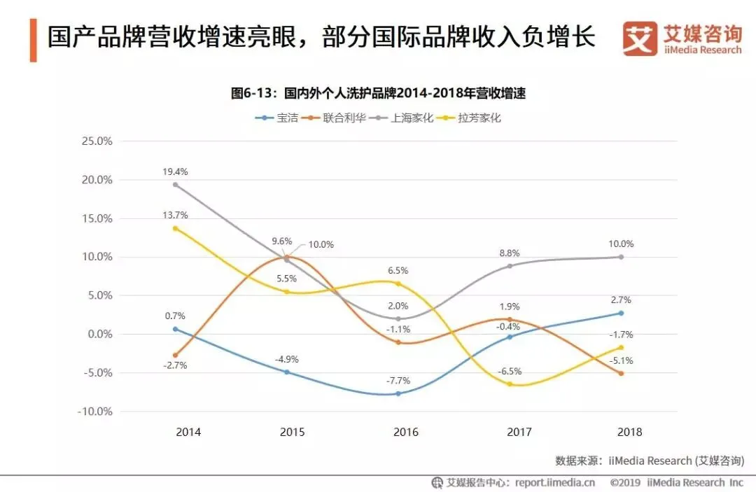 2018年中国个人护理品市场规模继续增长,已达到2619.0亿元。国产品牌(如上海家化)营收增速亮眼,部分国际品牌(如联合利华)收入呈现负增长。中国的家庭护理产品中,织物护理产品占63.3%。市场集中度相对较高,TOP10企业拥有超过六成的市场份额,其中立白、纳爱斯集团以较大的优势占据第一、二位。