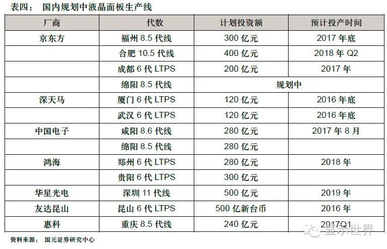 由于近年来我国面板生产线不断加大投入,未来产能能够完全满足下游需求。目前大陆还有13条液晶面板正在建设或规划中,总投资超过3000亿元,预计集中于2018年左右投产,建设中的生产线基本以6代LTPS 和8.5代线为主,最高的为华星光电的11代线。届时我国将成为全球第一大面板生产国,因此长期看面板产能过剩的局面不可避免。