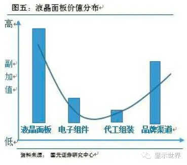 从液晶电视的制造产业链分析,由于液晶电视是典型的模块化生产,而且产业分工具有明显全球化的特点,因此符合价值链驱动产业发展模式,具体表现为液晶电视价值的增值在生产环节向流通环节转变过程中先减少后增加;另一方面,液晶电视产业链各部分价值呈现不对称的微笑曲线(面板生产价值增加最快,IC 组件和电视代工、组装最低,终端品牌渠道价值介于两者之间)。因此在液晶面板产业链上游的核心材料玻璃基板具有享有最高的价值增加。