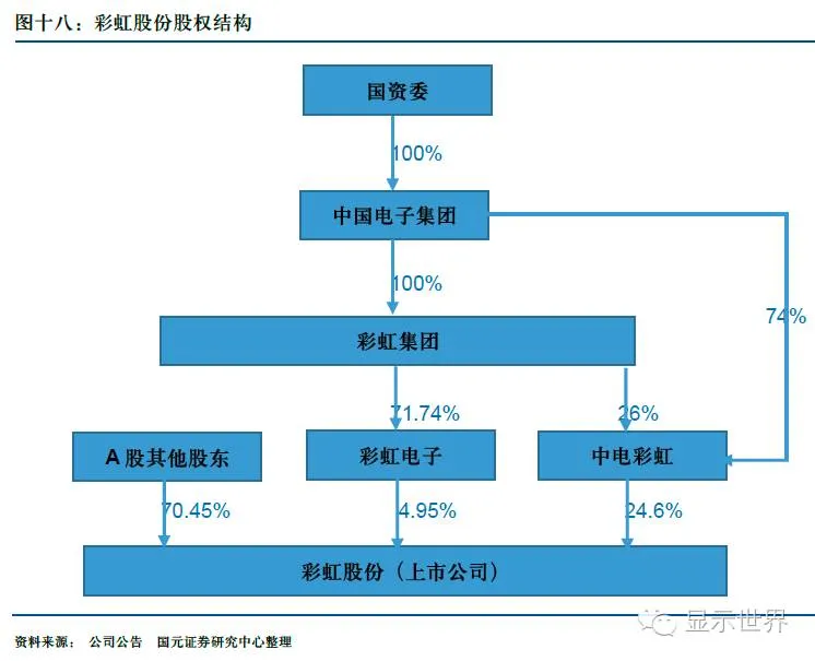 公司在2015年进行了一次较大规模的股权变更,在实际控制人不变的前提下(仍然为中国电子集团),中电彩虹通过协议转让方式分别受让彩虹集团持有的彩虹股份11.10%的股份和彩虹电子持有的彩虹股份13.50%,交易完成后中电彩虹拥有彩虹股份24.60%的股权,目前是公司第一大股东,具体股权结构图如下。