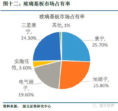玻璃基板行业属于典型的技术密集型和资本密集型行业,制造工艺复杂,高技术门槛,核心技术只被少数国家所掌握。目前,全球基板的主要供应商为美国的康宁、日本的旭硝子、电气硝子、安瀚视特等几家占据了市场99%的份额,其中康宁占据了50%的份额。国内玻璃基板产业起步较晚但发展迅速,目前只有彩虹和东旭掌握了生产技术,能够实现批量生产。