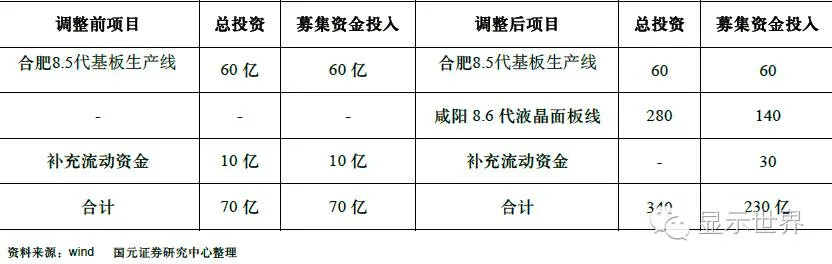 公司2016年上半年调整了定增方案。原计划是募集70亿元资金用于合肥8.5代玻璃基板项目建设,调整后方案除了玻璃基板外还增加了咸阳8.6代液晶面板生产线(计划总投资280亿)。
