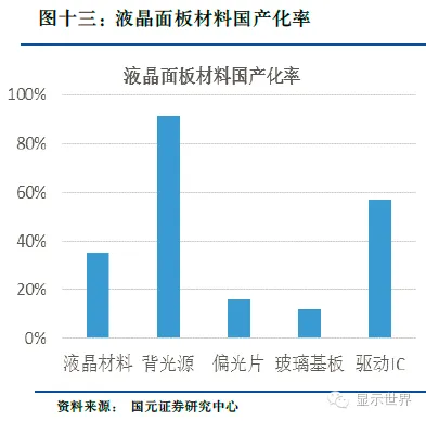 前玻璃基板在液晶上游原材料中相比于液晶材料、背光源、偏光片、驱动IC来说的国产化比例非常低,明显表现出对面板产业的支撑不足。