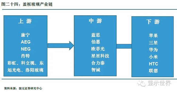 盖板玻璃全产业链分三部分: (1)上游盖板玻璃制造商,代表企业康宁、AEG、NEG (2)中游玻璃盖板加工商,代表企业蓝思、伯恩、欧菲光等(3)下游手机制造商,苹果、三星、华为等。