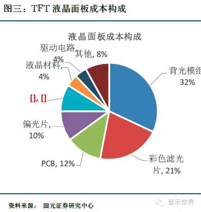 从成本构成看,两块玻璃基板约占整个面板成本的15%-20%左右。以42 寸液晶面板结构为例,其中玻璃基板成本约为18%(其中彩色滤光片含有另外一块玻璃基板的成本)。虽然相对于背光模组而言,玻璃基板的成本并不是最高的,但是却是生产难度最大、技术含量最高的部分。