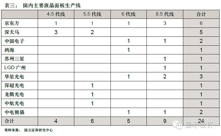 按代数分,4.5代线4条、3.3代线6条、6代线5条、8.5代线9条,总体看高世代线的占比较大。从投产厂家来看,京东方无疑排名第一,总共有6条线并且一半是8.5代线,华星光电虽然只有三条线,但两条都是8.5代;深天马5条线基本都是6代以下。