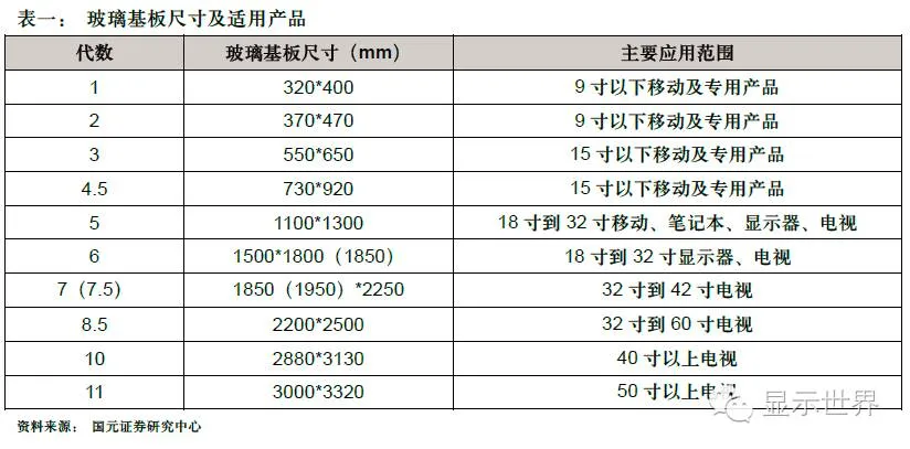 我们通常所说的G代线就是根据玻璃基板的大小尺寸决定了液晶面板的代数。不同的代数适合切割不同尺寸大小的面板,但其中也涉及到一个切割经济性的问题,因此要考虑到市场对某个尺寸面板的需求情况才能决定某代线是否适合切割多少尺寸的面板较为经济合理。例如5代线最高阶段的基板尺寸是1200×1300毫米,最多能切割6片27英寸宽屏LCD-TV用基板,所以5代线的上限是27英寸宽屏电视机;6代线经济切割的上限是37英寸;7代线经济切割的上限是46英寸;8代线的基板尺寸是2160×2460毫米,最多可以切割8片46英寸LCD-TV基板,切割6片52英寸LCD-TV用基板,52英寸是8代线的经济切割尺寸。