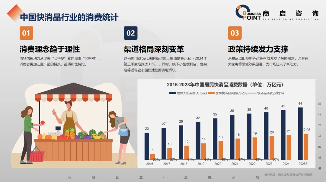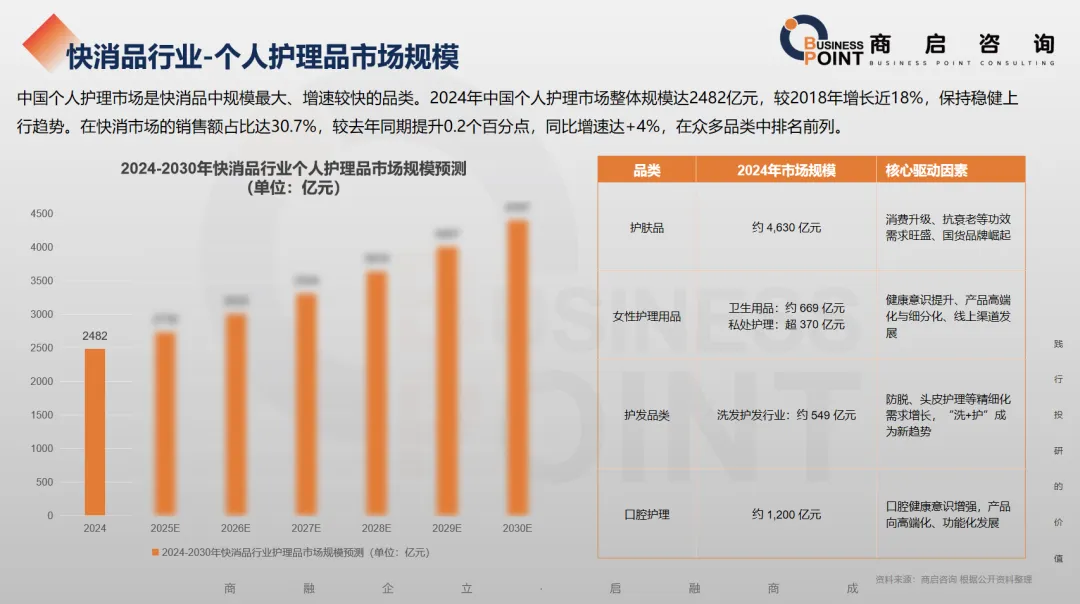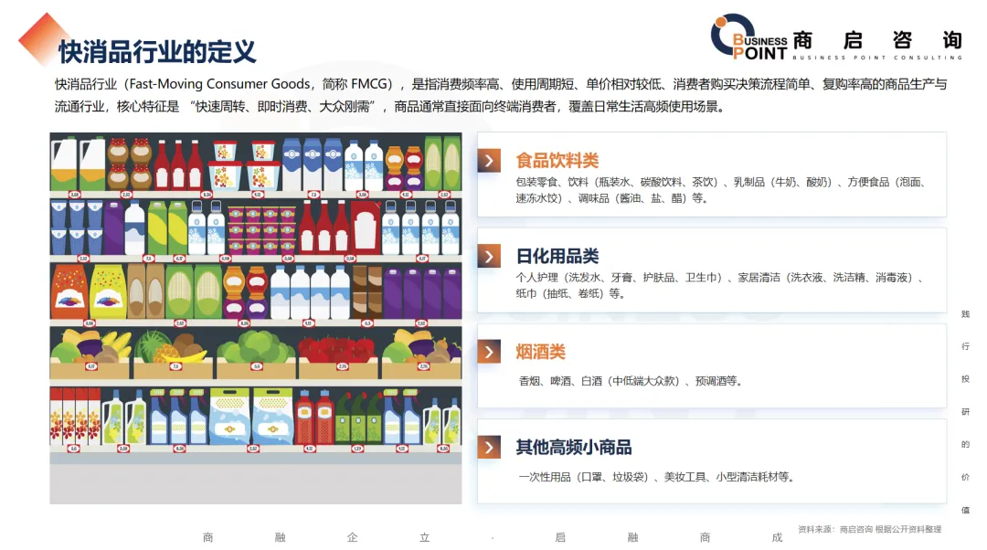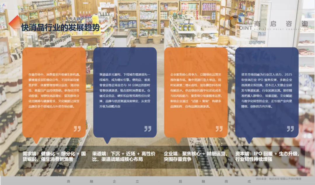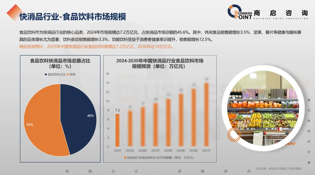 商启咨询预计,2025年中国快消品行业食品饮料规模达7.2万亿元,2030年达14万亿元。