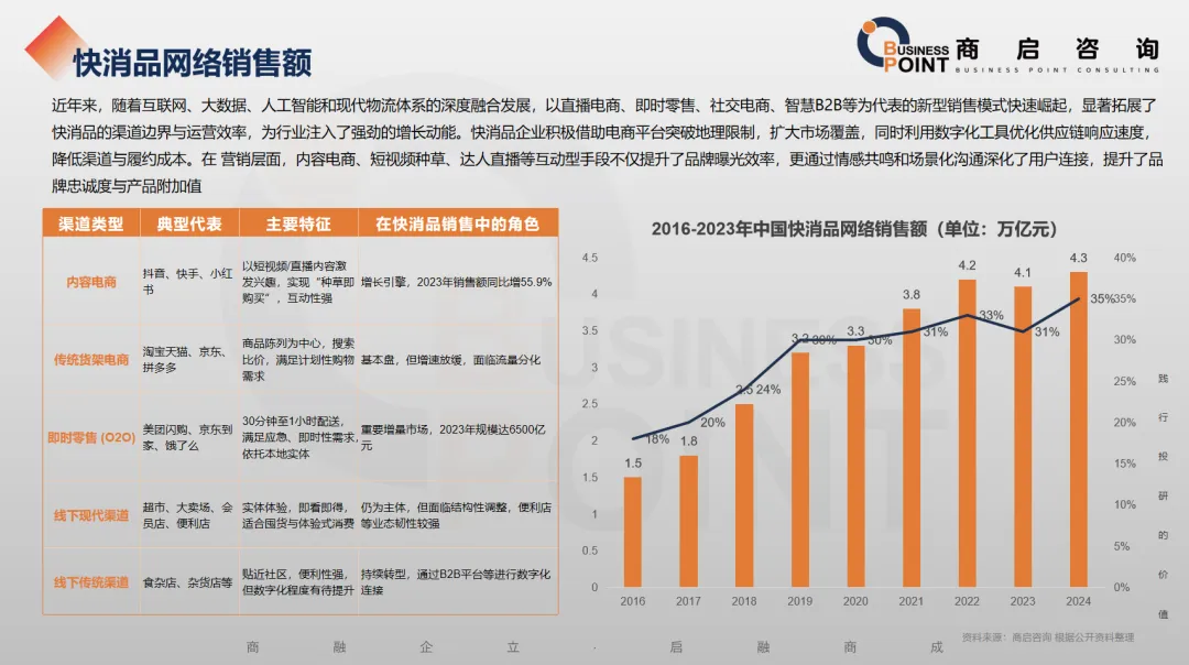 以兴趣电商为代表的新型线上渠道增长迅猛(2024年第三季度增速达31%),同时,线下小型便利店、食杂店等近场业态因便捷性而表现活跃。