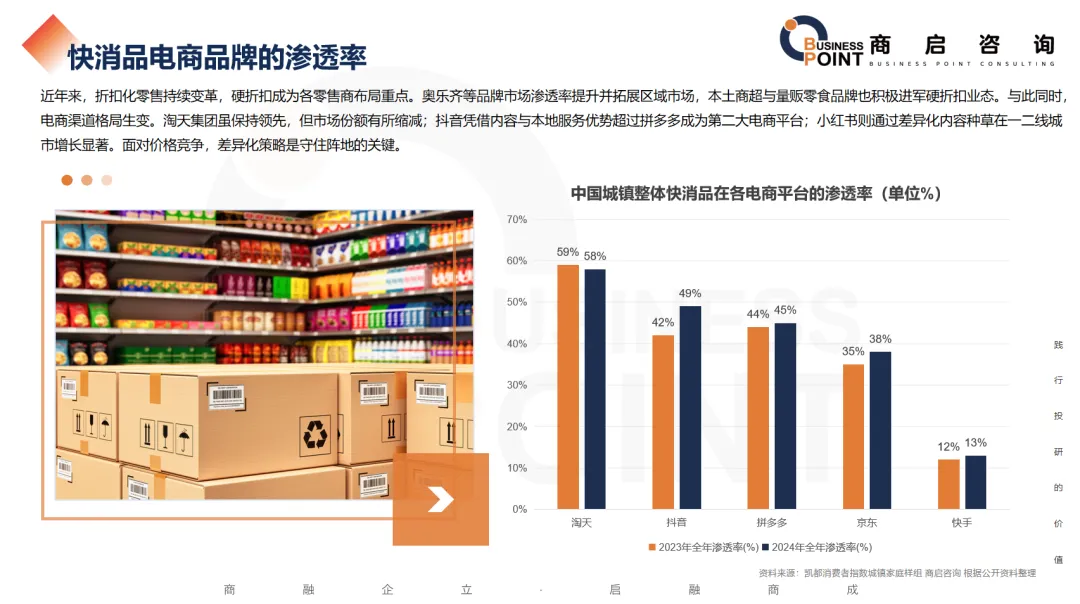 近年来,折扣化零售持续变革,硬折扣成为各零售商布局重点。奥乐齐等品牌市场渗透率提升并拓展区域市场,本土商超与量贩零食品牌也积极进军硬折扣业态。与此同时,电商渠道格局生变。淘天集团虽保持领先,但市场份额有所缩减;抖音凭借内容与本地服务优势超过拼多多成为第二大电商平台;小红书则通过差异化内容种草在一二线城市增长显著。面对价格竞争,差异化策略是守住阵地的关键。