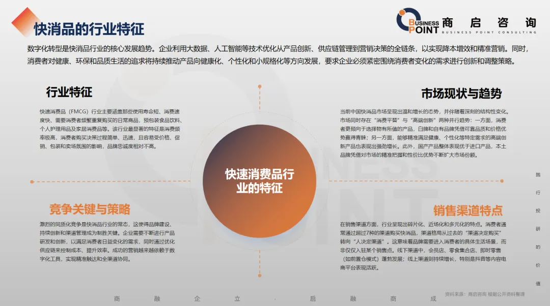 数字化转型是快消品行业的核心发展趋势。企业利用大数据、人工智能等技术优化从产品创新、供应链管理到营销决策的全链条,以实现降本增效和精准营销。同时,消费者对健康、环保和品质生活的追求将持续推动产品向健康化、个性化和小规格化等方向发展,要求企业必须紧密围绕消费者变化的需求进行创新和调整策略。