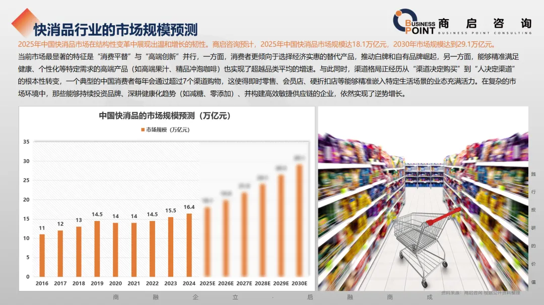 2025年中国快消品市场在结构性变革中展现出温和增长的韧性。商启咨询预计,2025年中国快消品市场规模达18.1万亿元,2030年市场规模达到29.1万亿元。