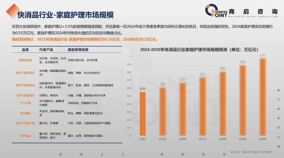 在四大快消领域中,家庭护理以3.5%的销售额增速领跑;并且是唯一在2024年前三季度各季度均保持正增长的类目,体现出较强的韧性。2024家庭护理类目规模约为0.55万亿元。家庭护理在2024年对快消大盘的正向拉动与稳健占比。商启咨询预计,2025年快消品行业-家庭护理市场规模约为0.55亿元,2030年约为1万亿元。