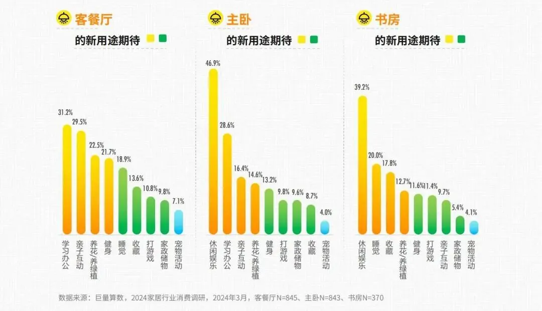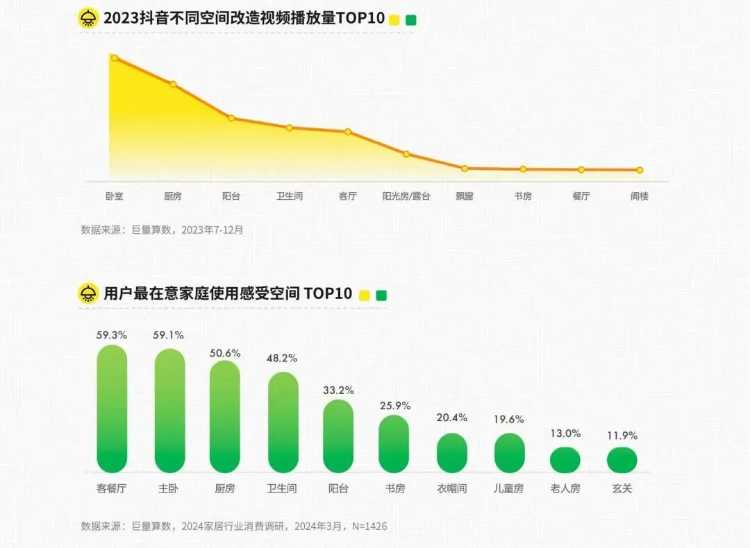 巨量视频数据显示,家居消费者对传统家居空间改造表现出更强烈的兴趣,暗示其对现有空间格局或功能的不满。调研数据也显示,消费者尤其关注家中核心空间的使用感受,如客餐厅、主卧、厨卫。家居空问的改造通常可以带来环境的提升,包括空间的舒适度、实用性、美观性等方面的改善,消费者可能希望通过改造来提升家居环境,使其更符合自己的居家需求与品味。