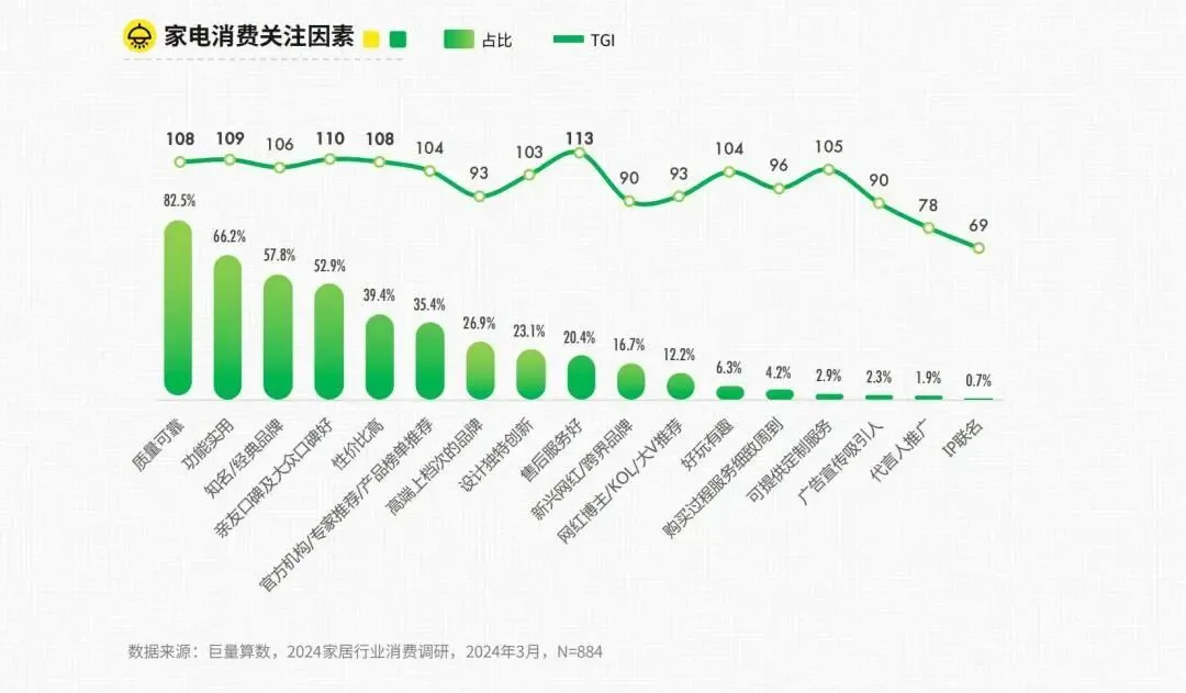 市场的不确定性使得消费者重新审视消费意义,他们在家居消费决策上更加审慎精明,会优先考虑质量可靠、功能实用、性价比等偏实际的特征。另外,知名或经典品牌、口碑等带有质量保证的先天因素也受到消费者重视。