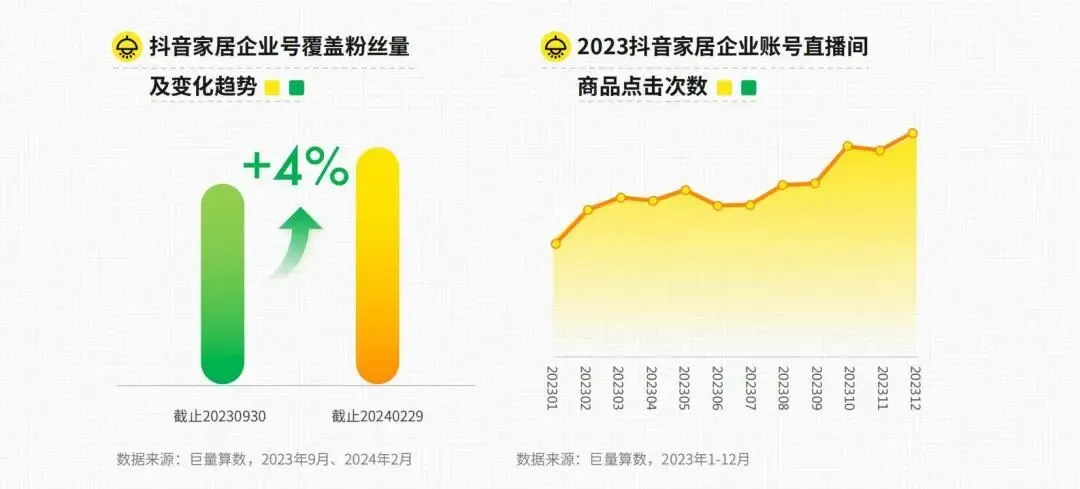 其中,短视频平台对家居消费的影响力不容小觑,其与传统电商平台的选择倾向已开始持平。巨量算数数据也显示,截止2024年2月末,抖音平台企业号粉丝数量增加了4%;消费者对于直播间产品的兴趣度也不断增长,抖音家居企业账号直播间的商品点击次数呈现持续增长态势。线上渠道已然成为家居品牌、消费者双向链接互动的重要阵地。