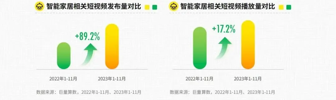 近些年,智能家居领域热度不断攀升,用户的家居智能消费也表现出极高热情。巨量算数数据显示,2023年1-11月智能家居相关内容发布量和播放量同比分别增长89.2%、17.2%。
