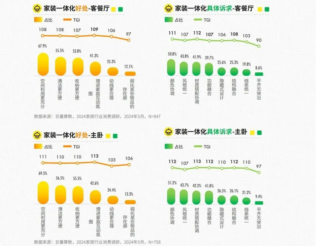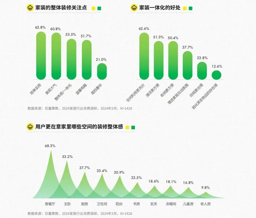 在整体装修中,家装整体感及一体化成为重要考量,除美观性外,切实好用是考虑家装一体化的主要动因消费者对客餐厅与主卧的“整体感”要求更高,更加注重这两个区域的统一性、连贯性和和谐性,希望它们能够呈现出一个统一、完整、协调的整体效果。