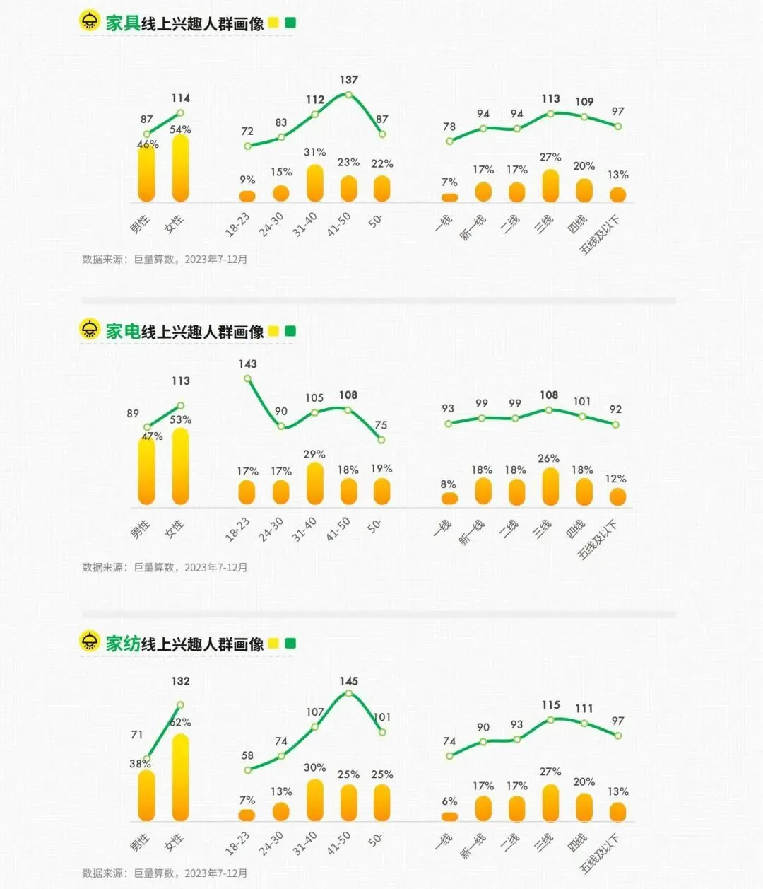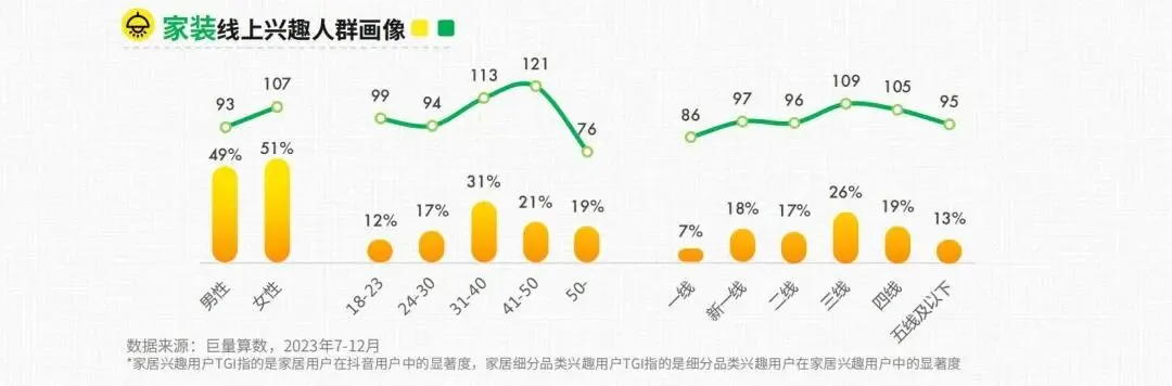 受到消费者个人喜好、生活方式、经济实力、地域文化等因素影响,线上家居市场的细分赛道兴趣人群呈现出一定差异。其中,线上家装兴趣人群以31-50岁为主;线上家具兴趣人群以女性与31-50岁为主;线上家纺兴趣以女性、31岁以上为主;而线上家电兴趣人群以女性、31-40岁为主,相比抖音整体人群,18-23岁年轻人与41-50岁中年人偏多。