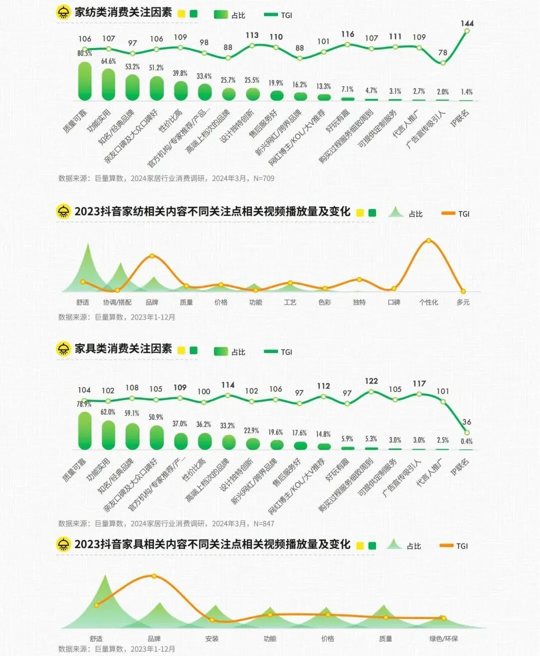 家纺消费方面,消费者更重视IP联名、新兴网红/跨界品牌等因素。家纺属于“软装潢”,是人们对个人品味和生活方式的展示,很多消费者希望通过家纺来彰显自己的品味和个性。巨量算数数据显示,关于“个性化”的平台内容视频播放量格外突出。